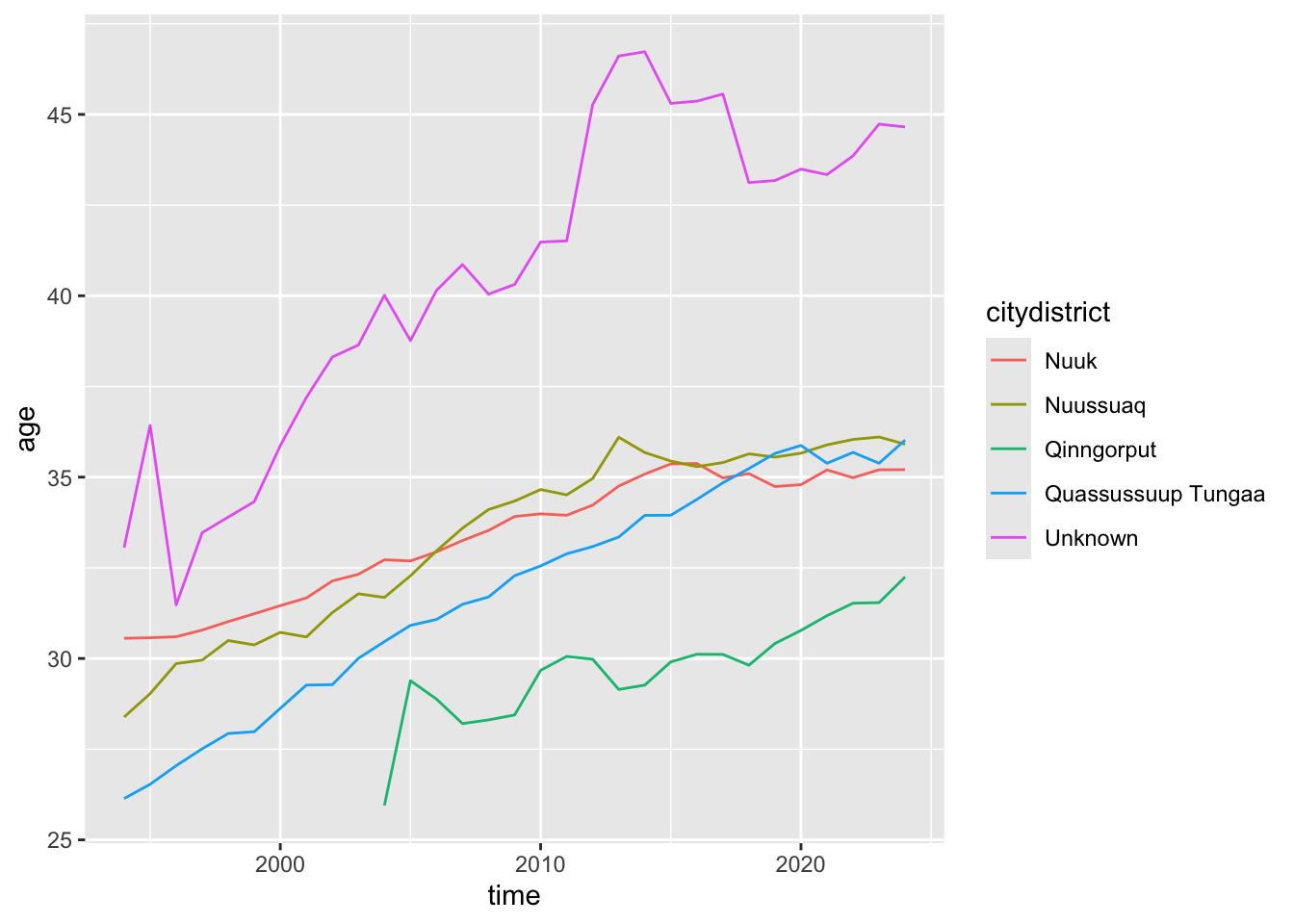 The Unknown group consists of very few people, so the pattern here is more of a data quality issue. The most interesting pattern is that of Qinngorput. I know that there are many families with children, so I’m guessing that’s what drives the (sustained) low mean age.