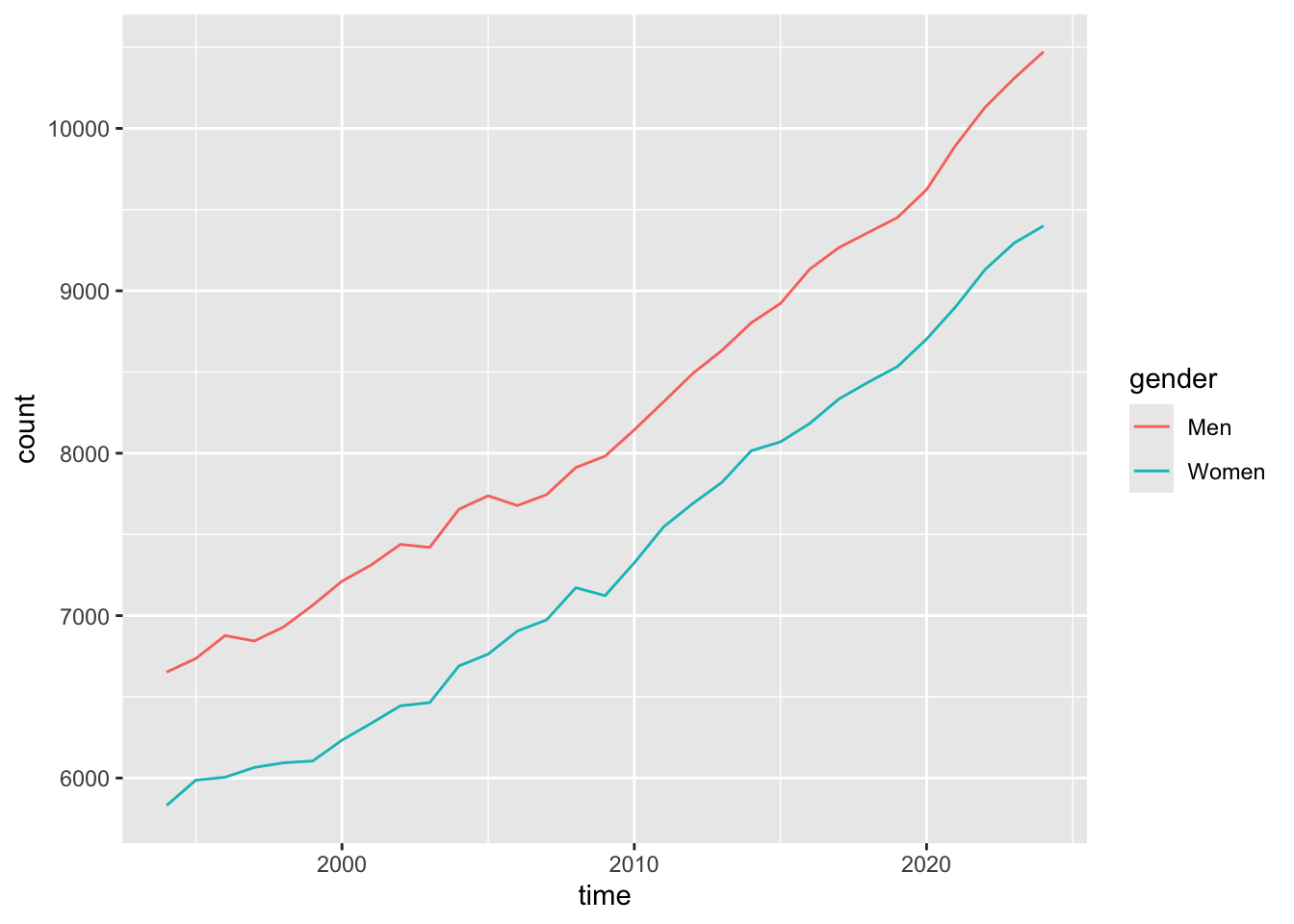 nuk_tidy %>%ggplot(aes(x = time, color = gender)) +geom_line(stat ="count")