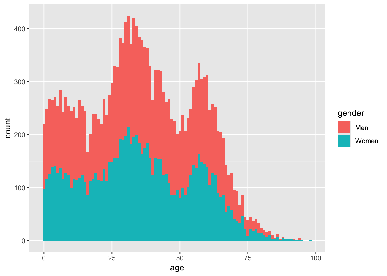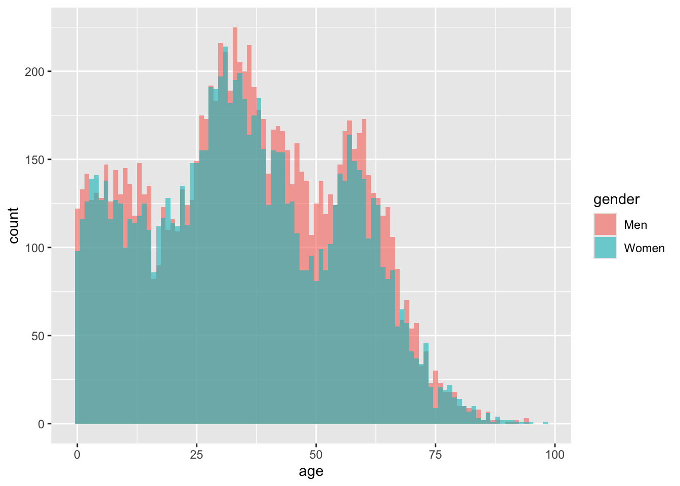 The two big humps in the distribution are millennials and boomers. Histograms colored in by a categorical variable like this, show the groups stacked on top of each other by default. This actually makes it hard to compare the groups, and can even give the false impression that there are twice as many men as women, across all age groups.