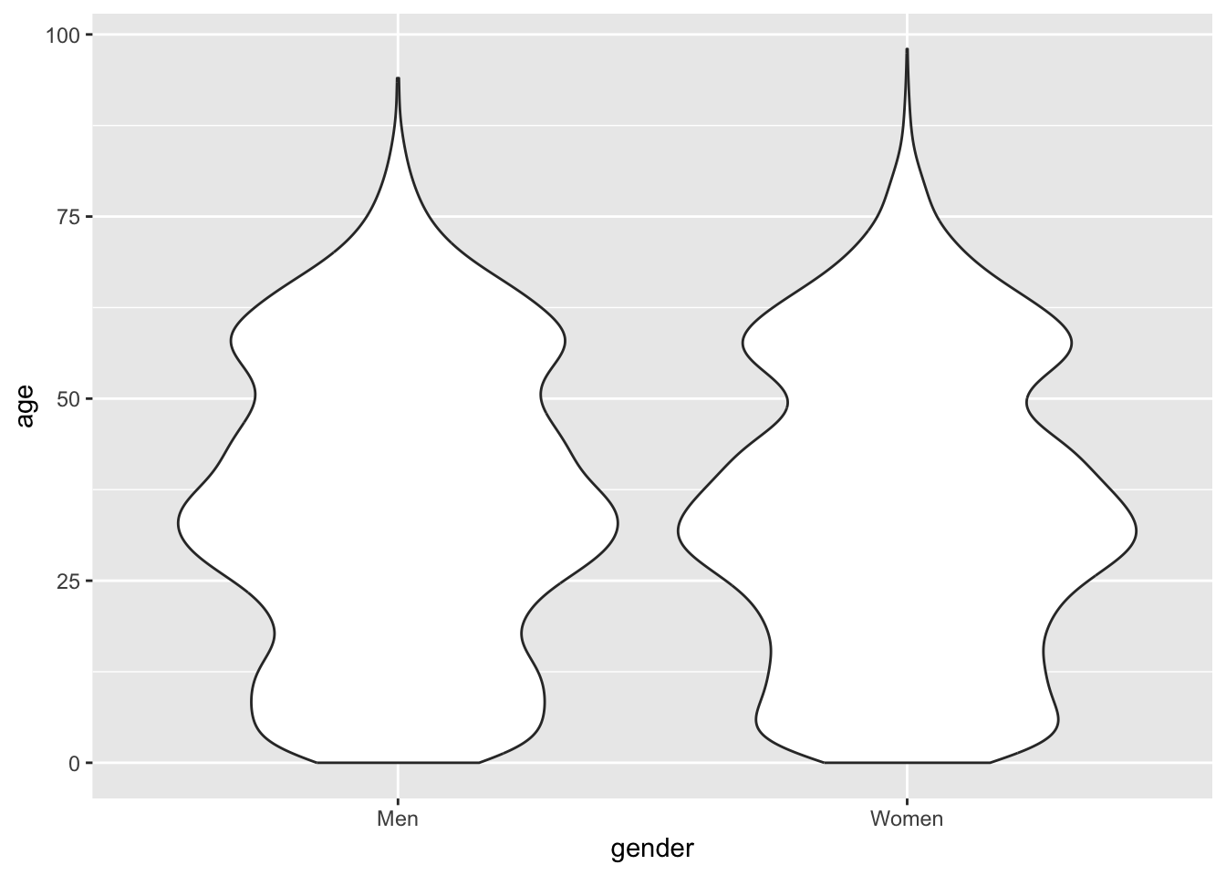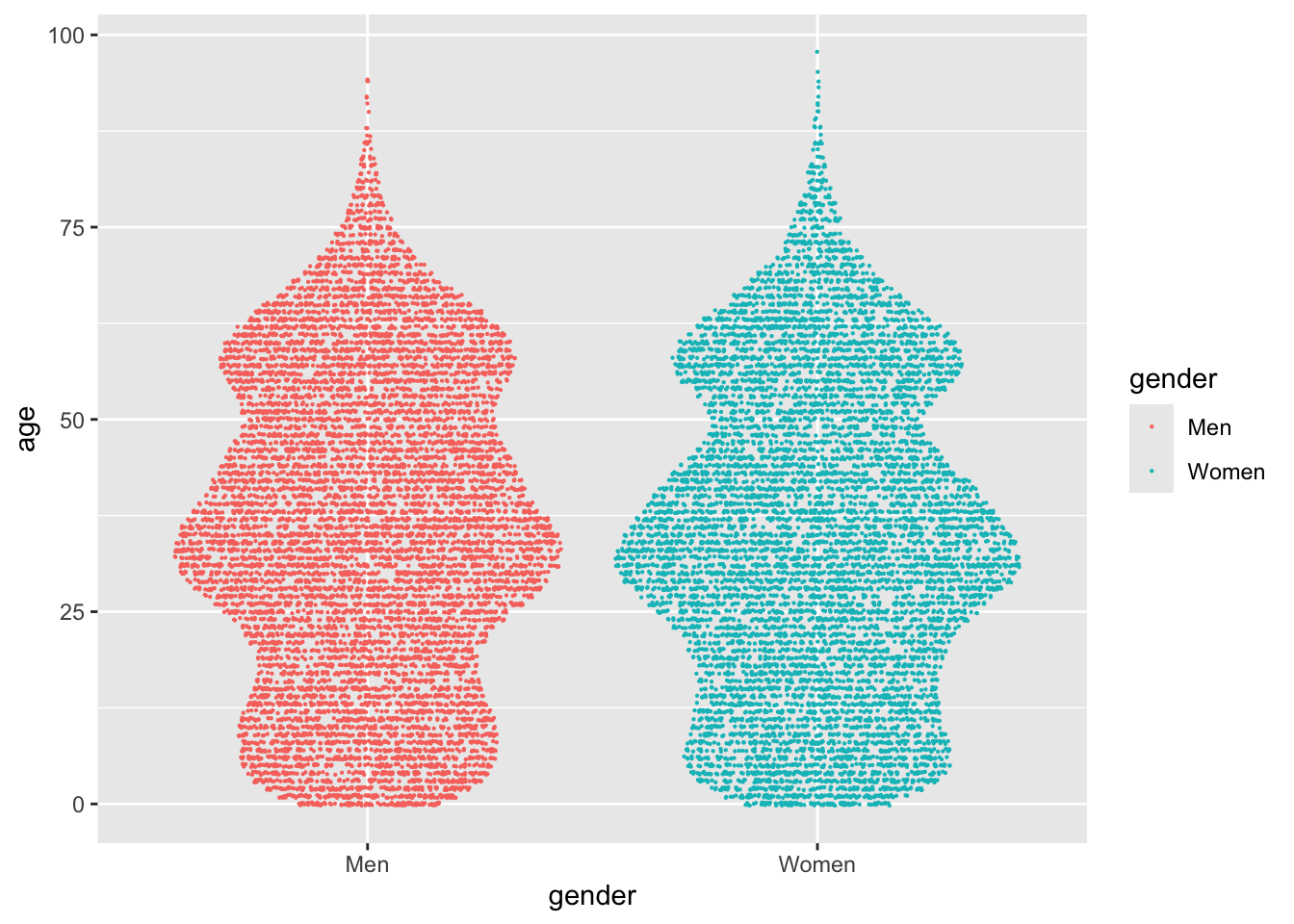 I can definitely tell that the violin representing men is wider at ages 40-50, while narrower in the same age range for women. While this is better, I still don’t have a good grasp of the size for the each group. When I’m in this situation, I would like to show the data - e.g. drawing a point for each observation. Something like: