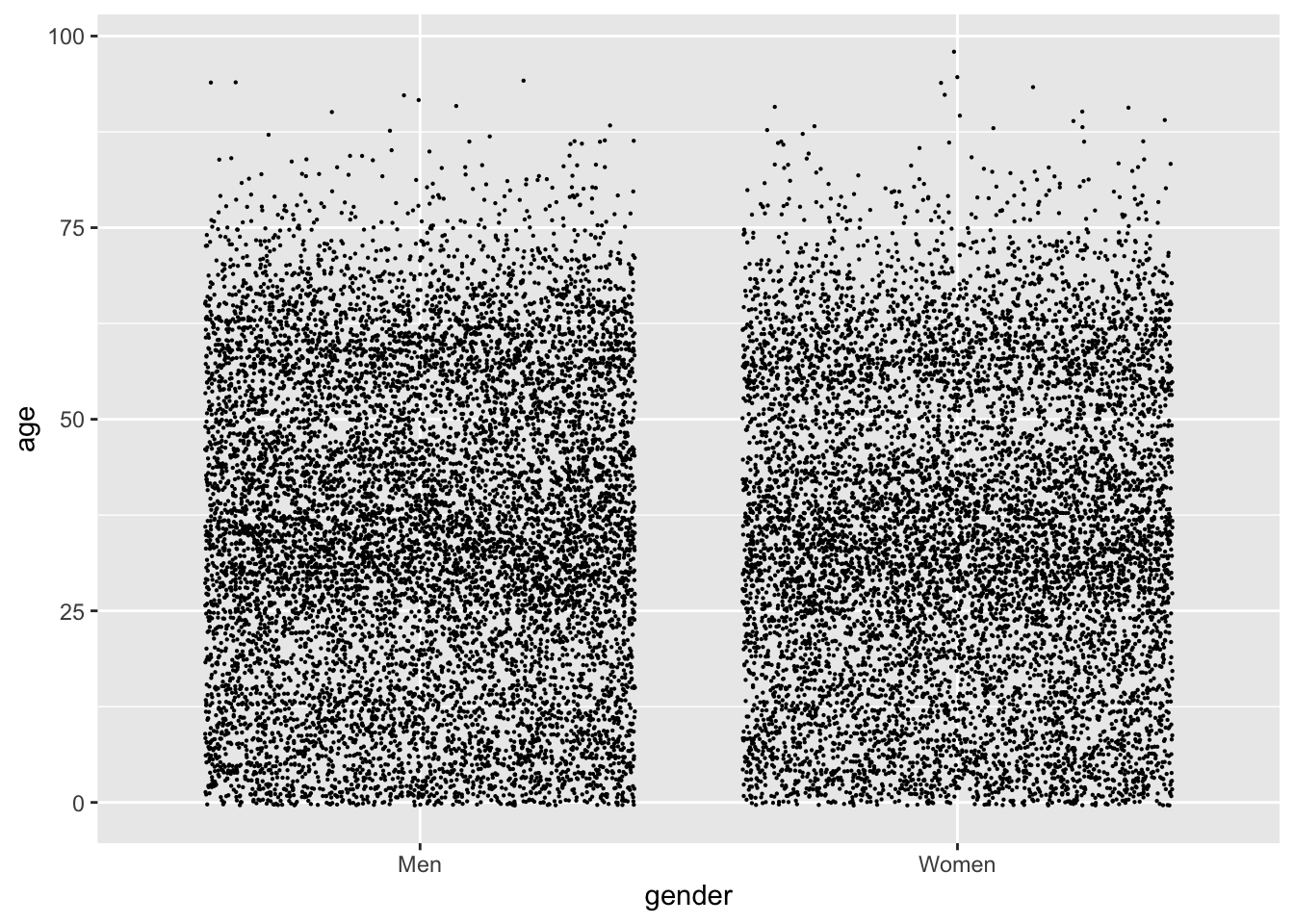 nuk_latest %>%ggplot(aes(x = gender, y = age)) +geom_point(size = .1, position ="jitter")
