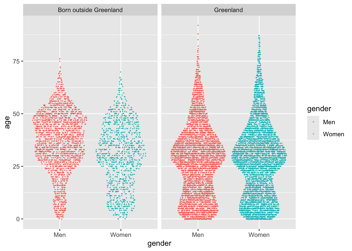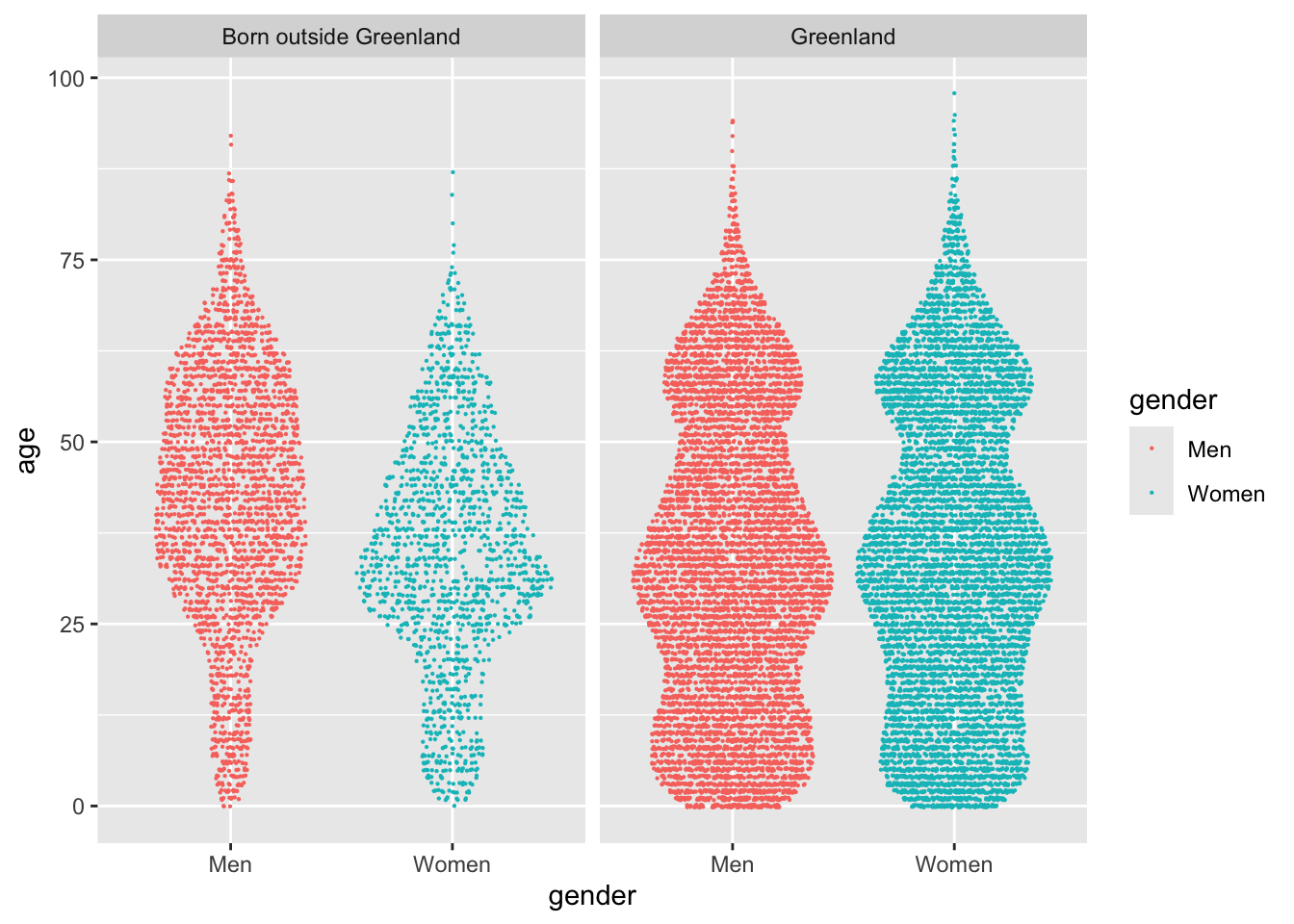 This plot genuinely blew my mind, first time I drew it. It explains why there are more men than women in the city, and tells an engaging story of the differences in the population of town. There is a definite difference in the age distribution of genders, primarily in people born outside of Greenland.