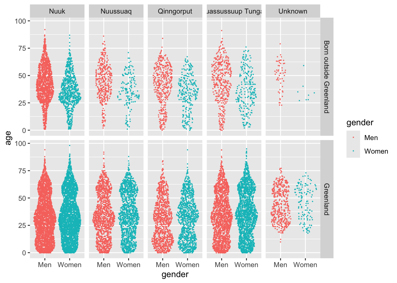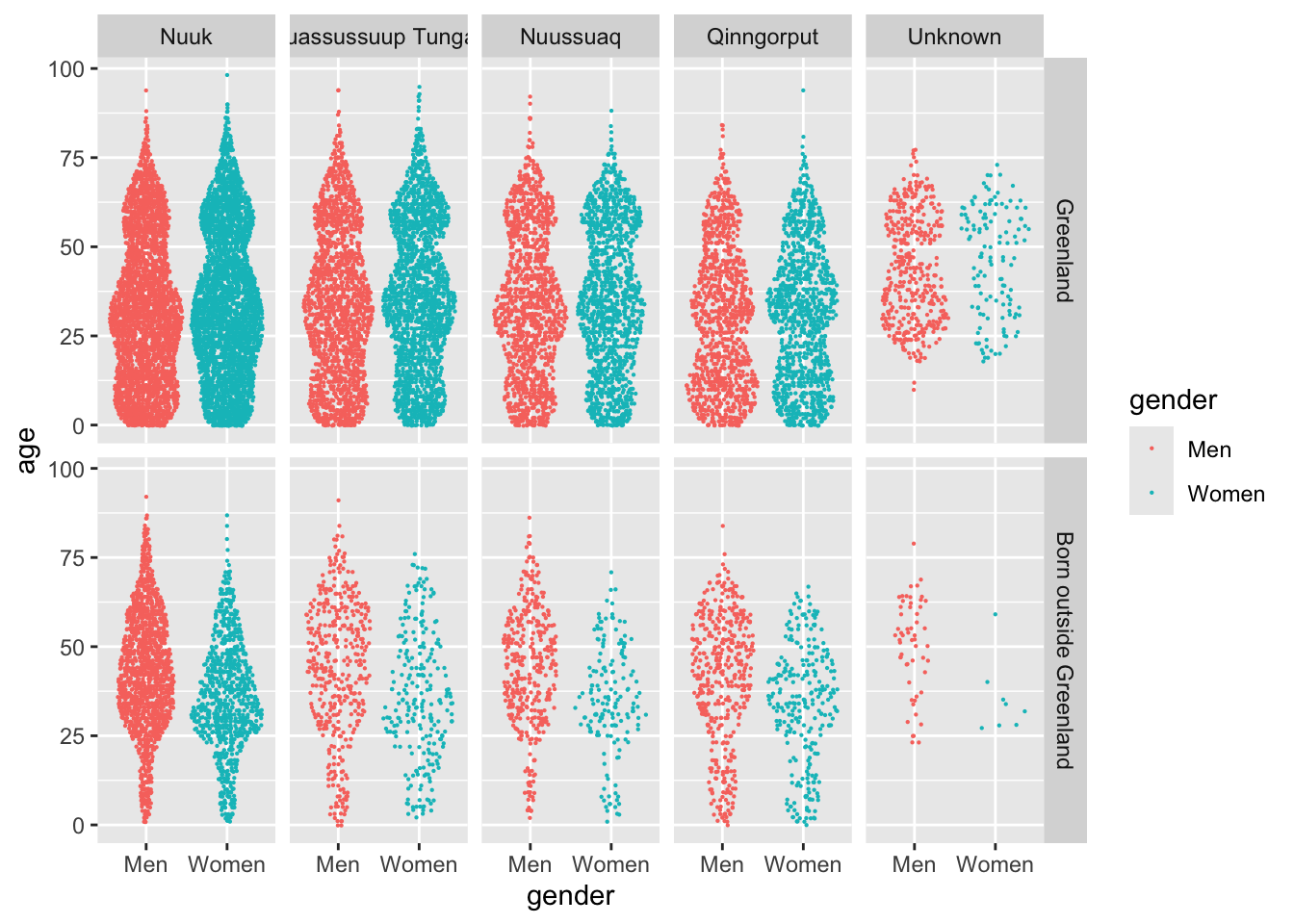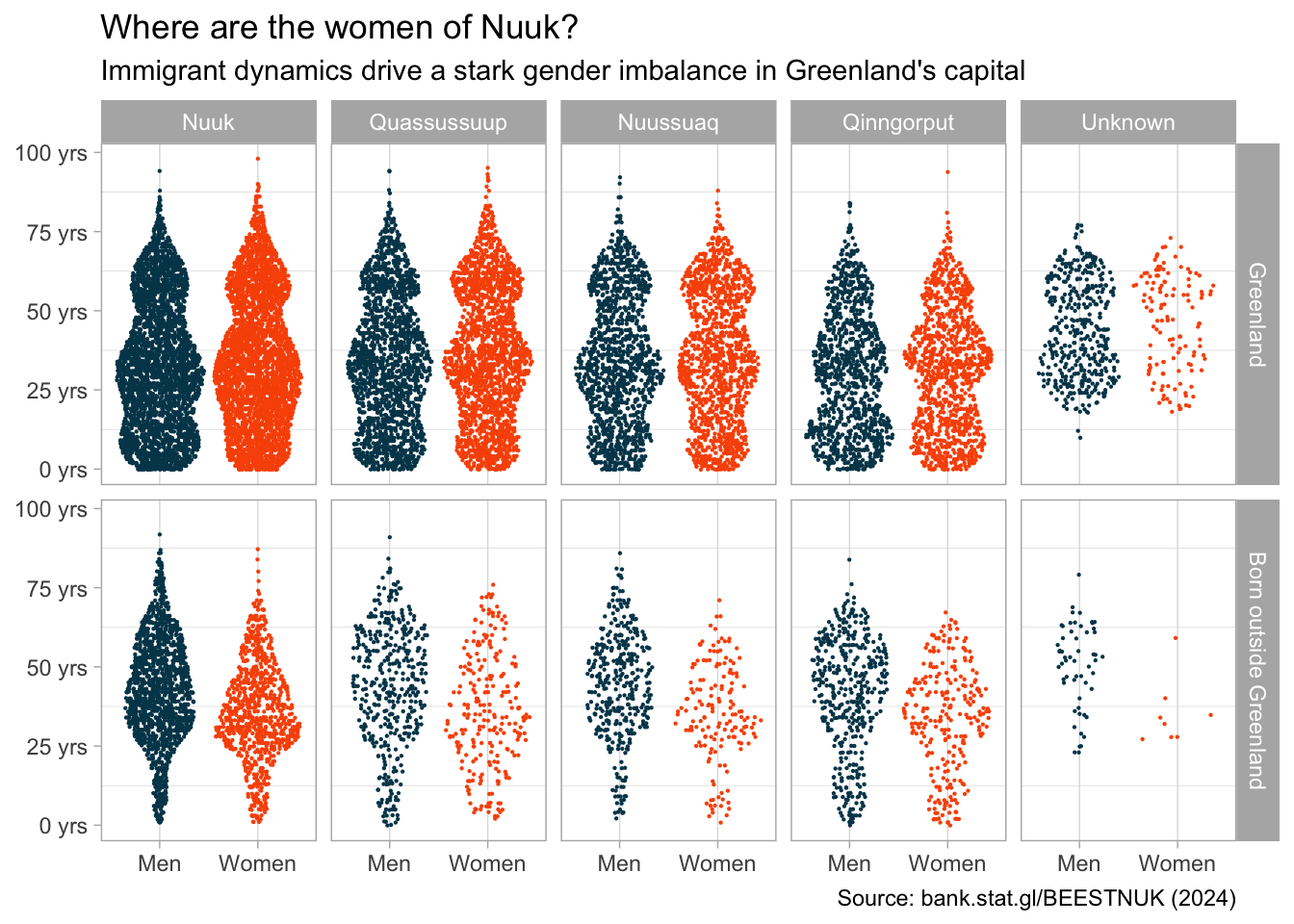 nuk_latest %>%mutate(citydistrict =word(citydistrict),across(where(is.character), fct_infreq) ) %>%ggplot(aes(x = gender, y = age, color = gender)) + ggforce::geom_sina(size = .1) +facet_grid(`place of birth`~ citydistrict) +scale_color_statgl() +scale_y_continuous(labels = scales::unit_format(suffix =" yrs")) +labs(title ="Where are the women of Nuuk?",subtitle ="Immigrant dynamics drive a stark gender imbalance in Greenland's capital",caption =paste0("Source: bank.stat.gl/BEESTNUK (", max(nuk_tidy$time), ")"),x =NULL, y =NULL) +theme_light() +theme(panel.grid.major.y =element_blank(),legend.position ="none" )