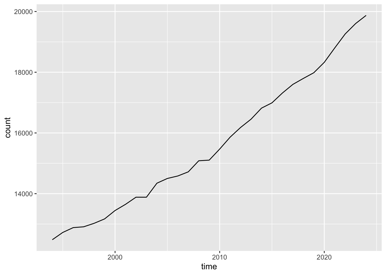 Statistics Greenland maintains a census table on the population of Nuuk, updated once a year. It’s available through the Statbank here. While I could go ahead and download the data from their site, it’s much easier to query the API from R instead.