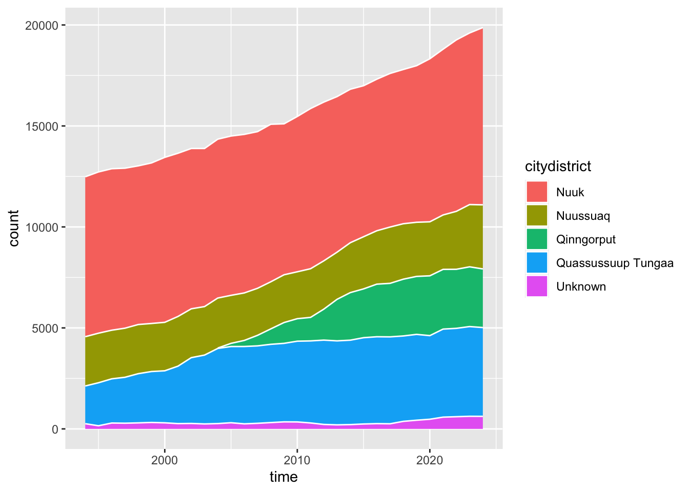 nuk_tidy %>%ggplot(aes(x = time, fill = citydistrict)) +geom_area(stat ="count", color ="white")