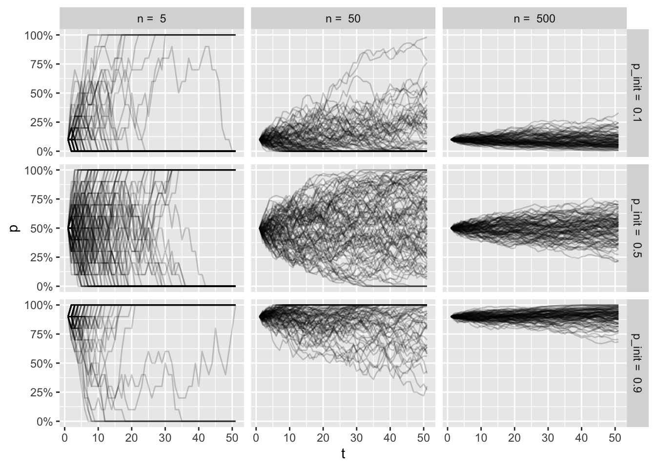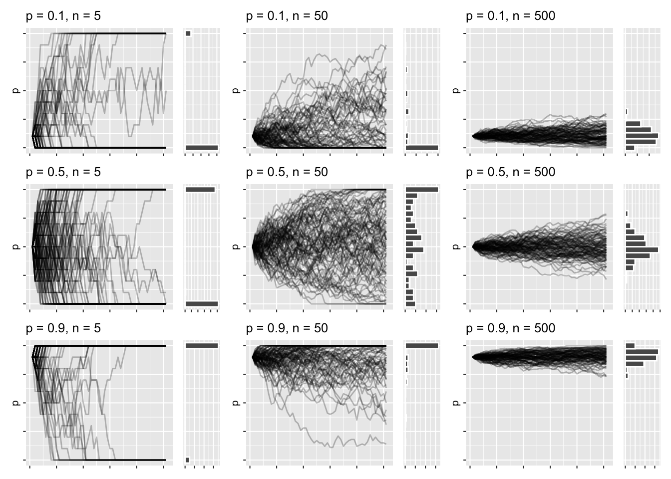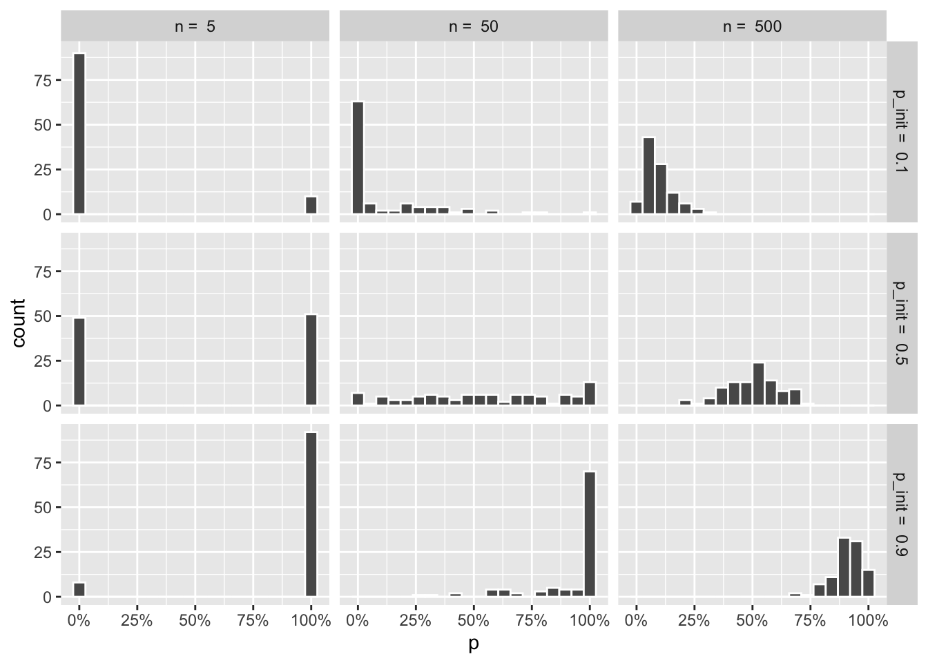 wf_plots <- crossing(p_init = c(.1, .5, .9), n = c(5, 50, 500)) %>%