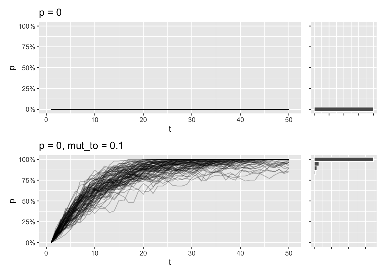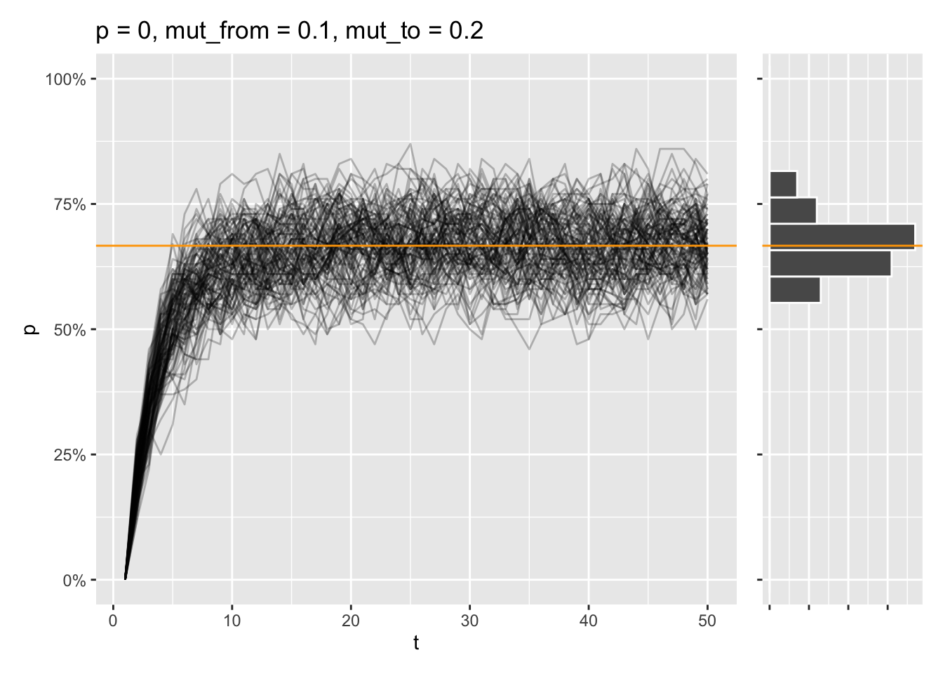 draw_sims(sim_function = wf_sim_mutation, p = 0, mut_from = .1, mut_to = .2) &