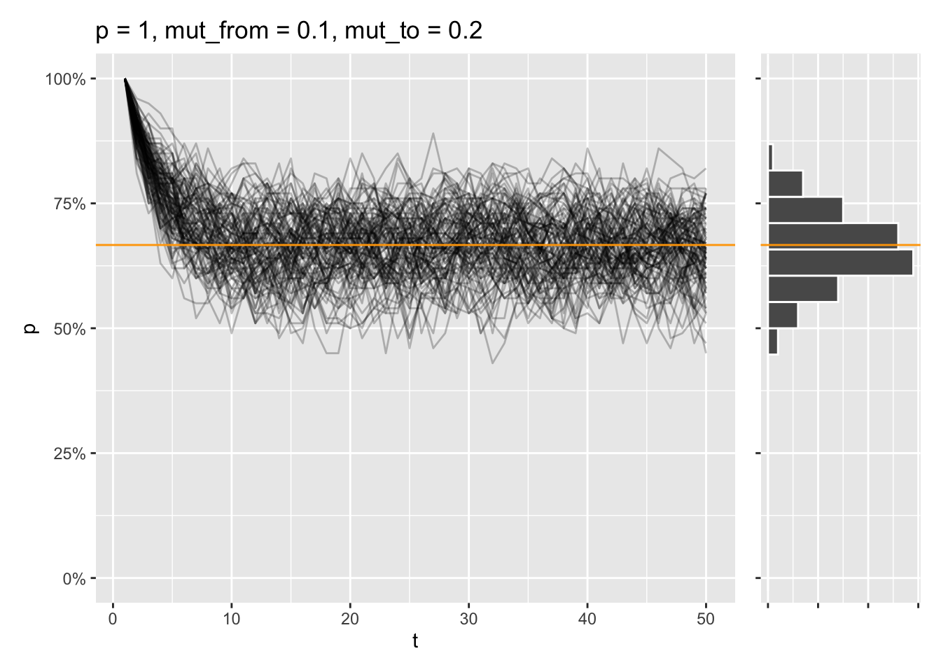 draw_sims(sim_function = wf_sim_mutation, p = 1, mut_from = .1, mut_to = .2) &