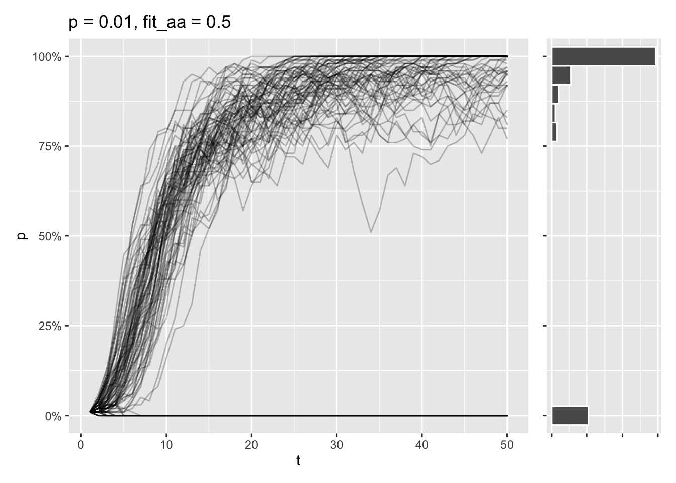 Still, some of simulations end in the \(A\) allele being lost, as the initial allele frequency is very low. At this point, there’s a tug-of-war going on, where genetic drift wants to delete the allele entirely, while selection tries to fix the allele completely.